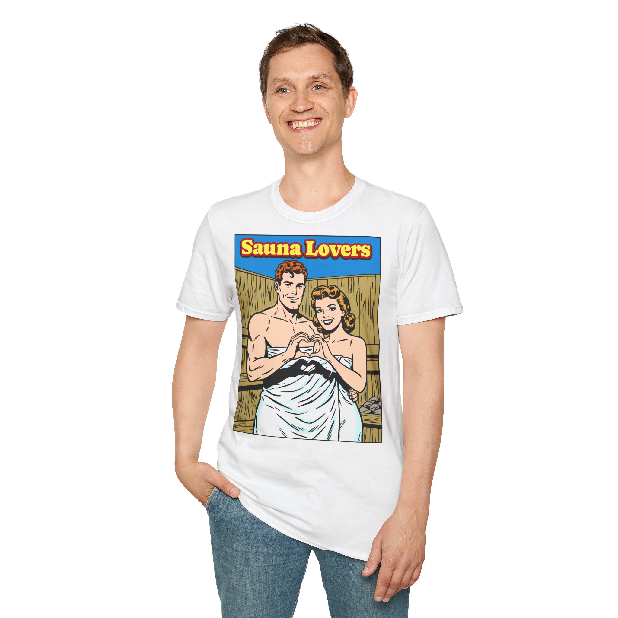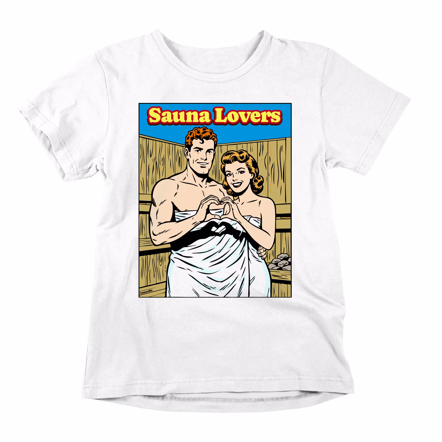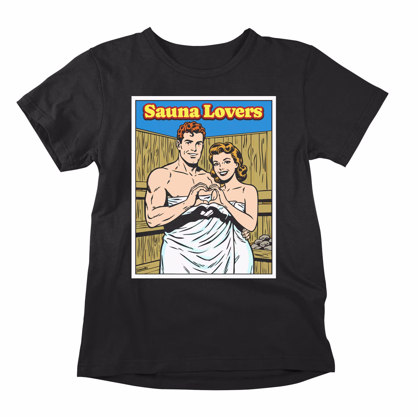 This retro comic-inspired tee captures that perfect moment — two hearts, one sauna, zero complaints about the temperature.