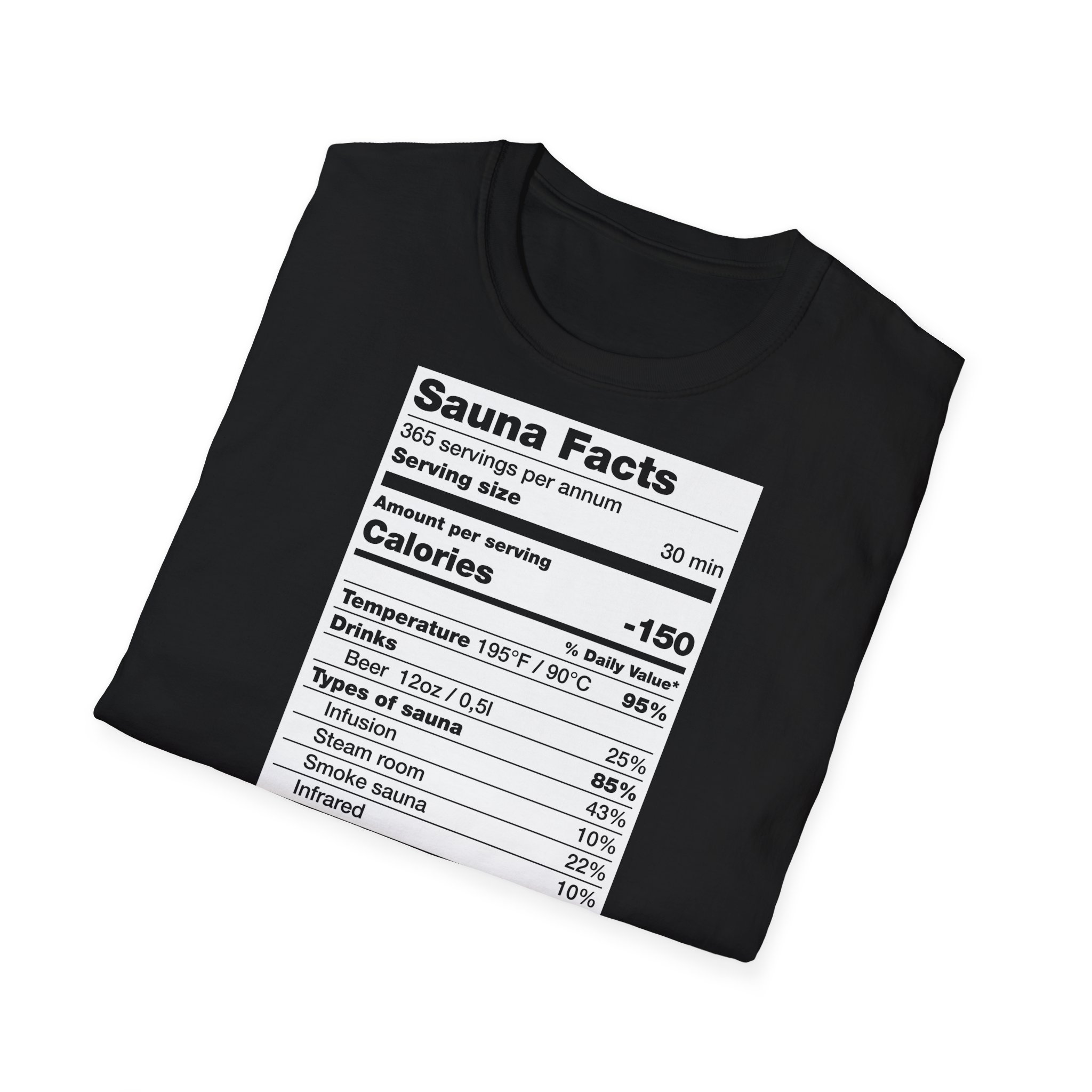 Tämä paita näyttää siltä kuin siinä olisi ravintoarvot, mutta todellisuudessa se kertoo kaiken oleellisen onnistuneesta saunomisesta.
